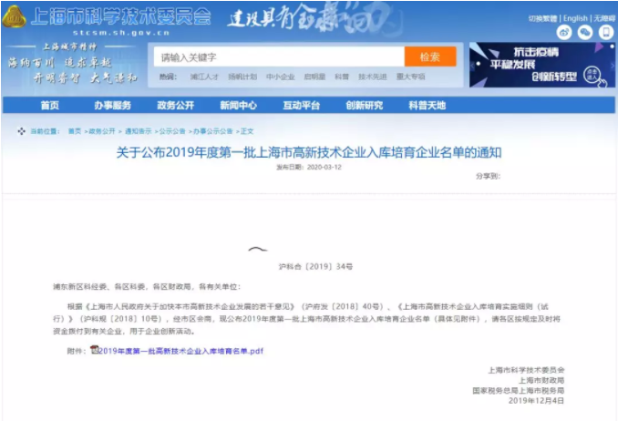 近日,上海市科學(xué)技術(shù)委員會(huì)發(fā)布《關(guān)于公布2019年度第一批上海市高新技術(shù)企業(yè)入庫(kù)培育企業(yè)名單的通知》。
